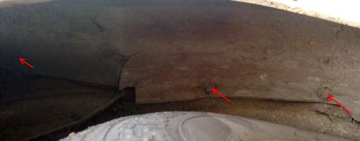Во внутренней части арки установлен заводской подкрылок, по ходу машины в задней части крыла. Крепится 3 болтиками на 8 мм. В случае, если у Вас установлены не оригинальные подкрылки, защищающие всю колесную арку — предварительно необходимо демонтировать их.